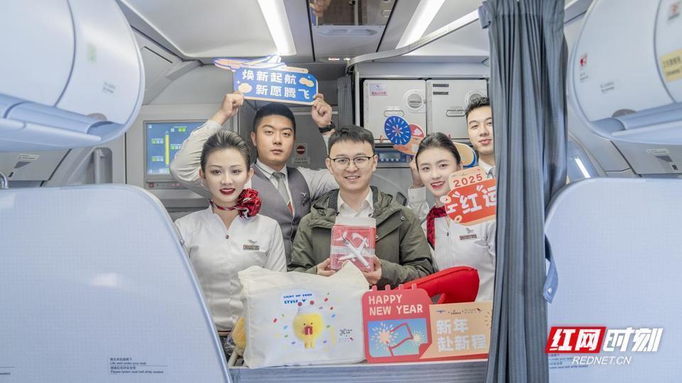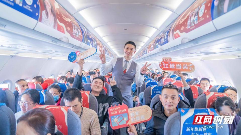 “新年焕新色,红运一整年”主题航班启航。红网时刻新闻1月23日讯(记者 肖帅 通讯员 罗艳)新年新气象,鸿运当头照。1月23日是南方农历小年,在A67775(长沙-成都)航班上,湖南航空联合花王莉婕、长沙机场开展“新年焕新色,红运一整年”主题活动,活动分为机上主题航班和机场新春活动,与旅客一起迎接鸿运,开启一年的好运之旅。活动现场,湖南航空特别融入了新春元素,从客舱内的装饰布置到地面活动的主题设计,无一不透露着浓浓的年味。让旅客在旅途中就能感受到节日的欢乐和祝福,增添回家的温馨与喜悦。“您好,欢迎乘机!”乘务员手持“红运当头”“新年赴新程”主题宣传板在客舱门口迎接旅客。在航班起飞前,每位旅客都收到一份新春礼包,给旅程增添一份惊喜与愉悦。