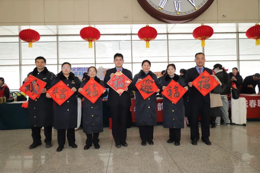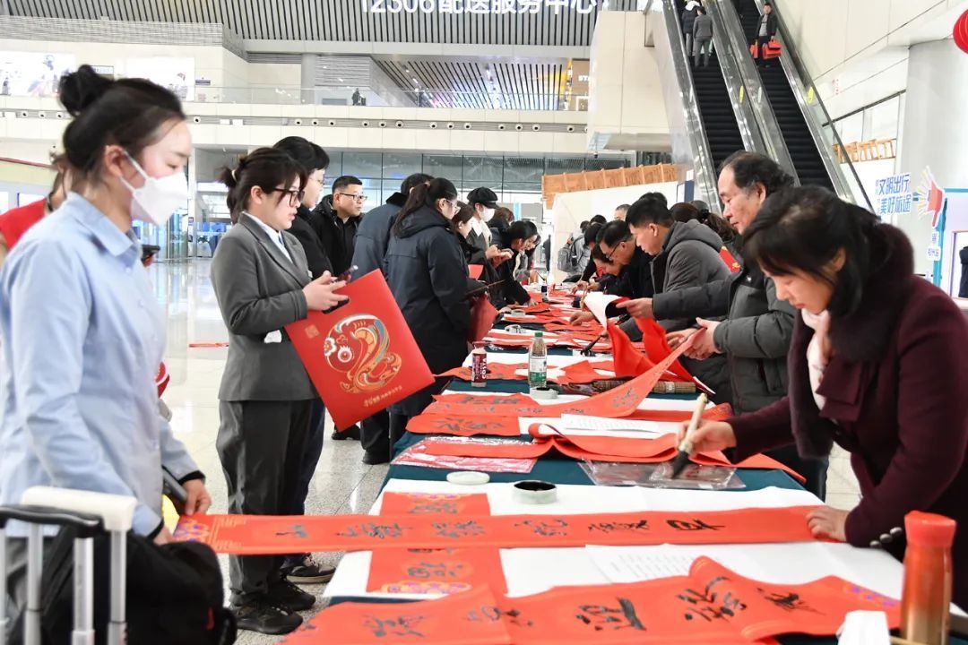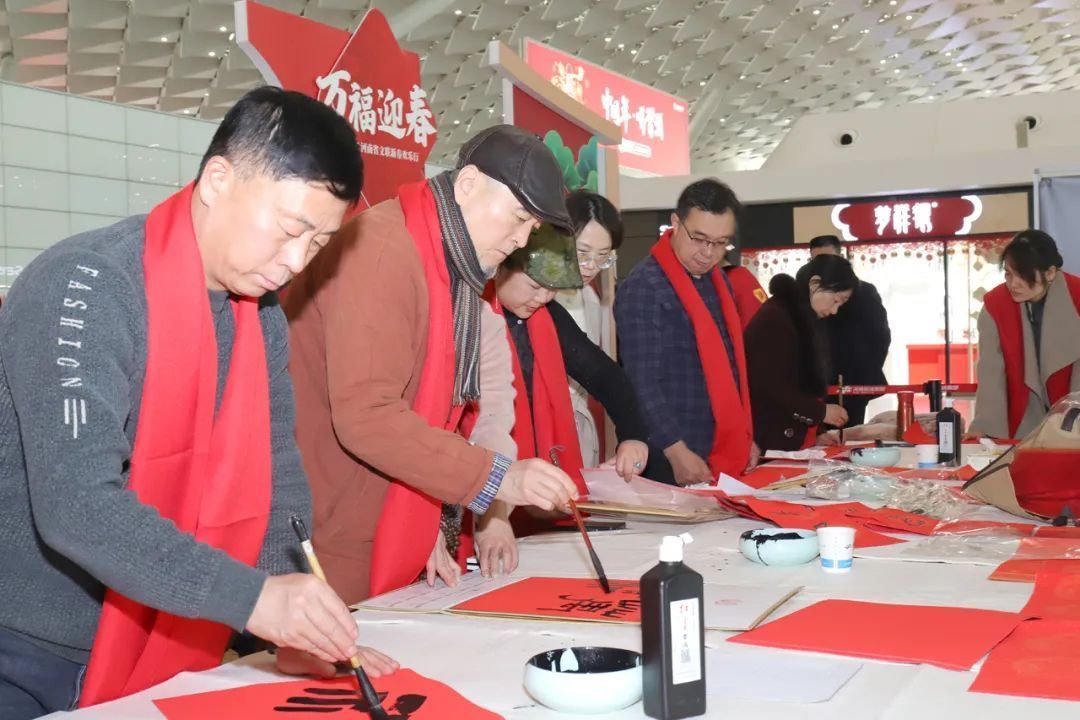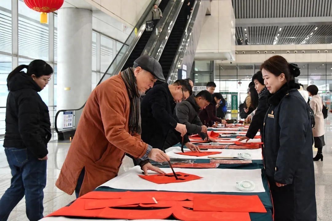 民盟中央美术院河南分院常务院长、河南省美术家协会副主席李健强,马健中、顾建全、郑志刚、杨开伟、许广丽、田华璞、张玲丽、沈克明、冯明威等书画家,现场开展义写春联活动,为旅途中的人们送去了一份充满“艺”味的文化惊喜。