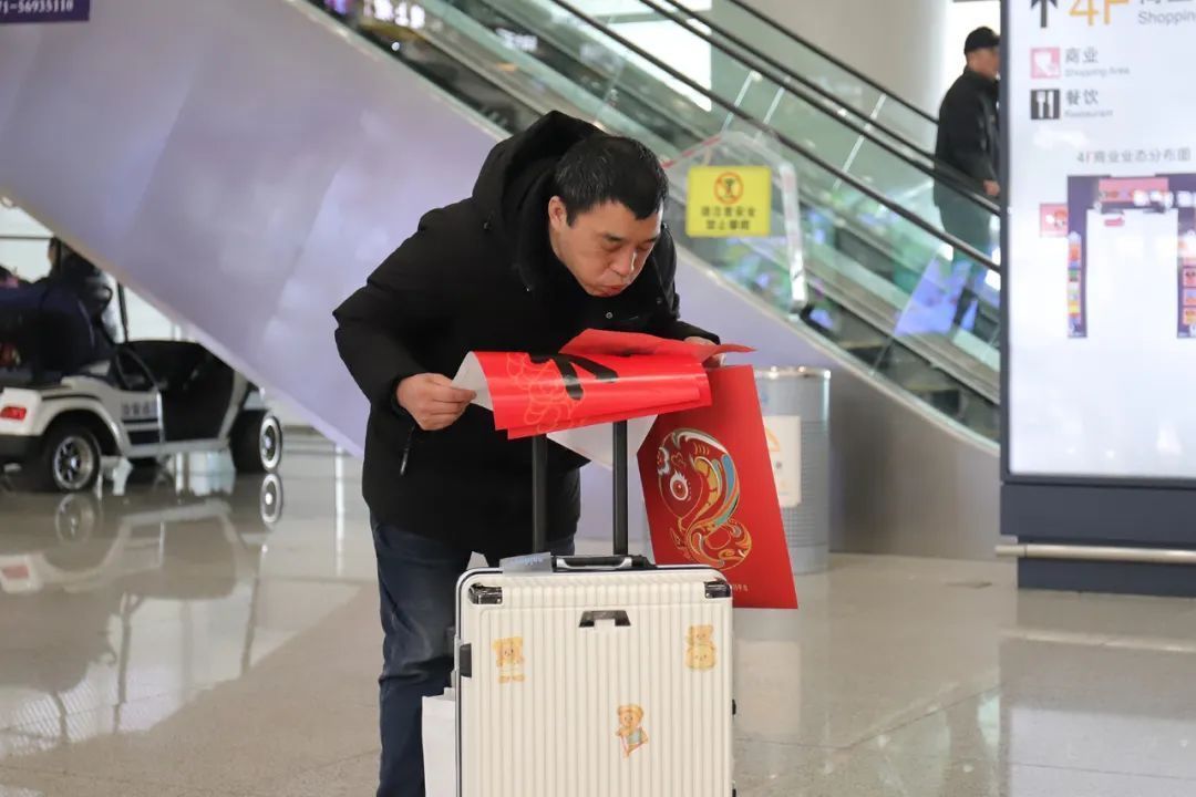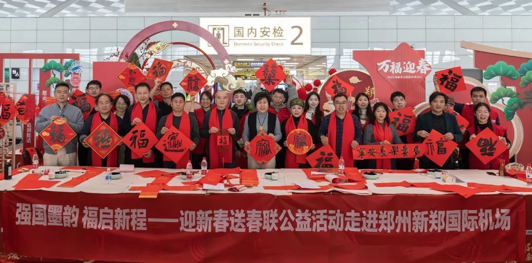 李健强说,郑州东站、郑州新郑国际机场是面向大众展示河南的重要窗口。民盟中央美术院河南分院的10位书画家共同参与此次送春联公益活动,很有意义。对于创作者来说,这也是贯彻“艺术为人民”理念的具体实践。“希望我们用真情书写的春联和‘福’字,能在(北方)小年这个特殊的日子里,让广大旅客感受到诚挚的祝福和欢乐祥和的氛围。”