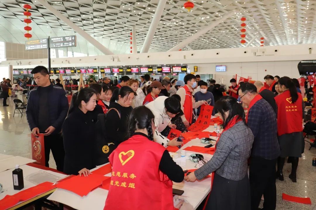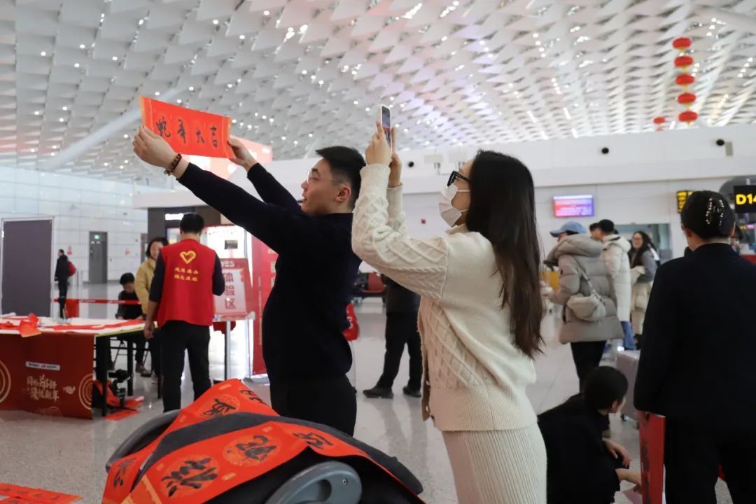 当天上午,在人来人往的郑州东站候车厅,喜庆祥和的“春联红”格外引人注目。不少旅客驻足现场,观摩欣赏、拍照打卡,还纷纷领到了名家手写春联。下午,在郑州新郑国际机场航站楼,侯机的旅客们很快便被写春联活动吸引过来,围得里三层外三层。
