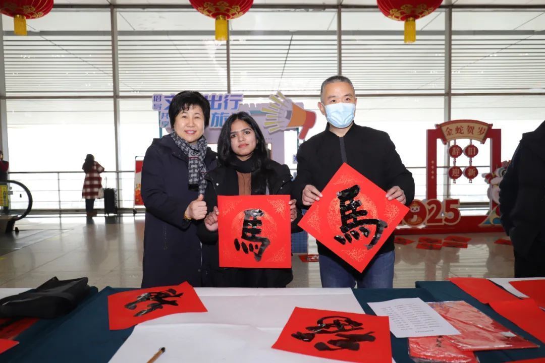 “没想到上飞机前还能领到名家春联,河南文化就是厚重!”一位来郑州出差的哈尔滨旅客言语间透露着喜悦。“老师写得真好,这个小年儿太有意义了!”一位母亲和喜爱书法的孩子在活动现场待了许久,他们当天收获了两副春联,还不时向书法家请教。
